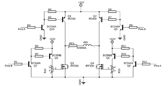 Due to the sequential drive characteristic of stepper motors, it was necessary to design a full bridge inverter circuit (Figure 7) that offered the possibility of controlling the current at the output by means of an analog component, in contrast to the traditional method of pulse width modulation (PWM). For this purpose, potentiometers were connected to the gate of the power transistors on the low side of the bridge, since they are field effect and the drain-source current is proportional to the voltage at the gate. In this way, adjusting the voltage divider in the potentiometers, the output current was adjusted to 2.5 A, in order to reduce energy consumption and prevent damage to motors and transistors. There were five full bridge inverters, two for each bipolar stepper motor, and an additional one to control the DC motors.