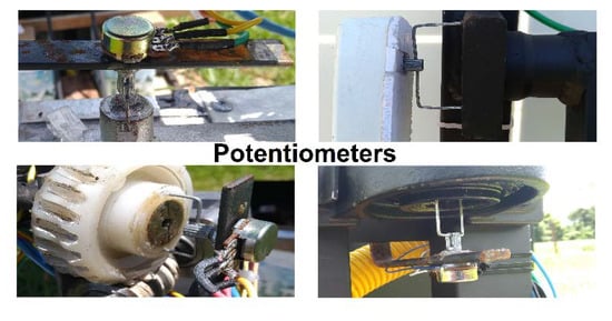 The sensing of the angular position of the two built structures was carried out by means of the analog reading of the central pin of linear rotational potentiometers with a total resistance of 1 kΩ. The relationship between the voltage read by the Arduino and the corresponding angle was performed in an experimental way, taking measurements at 5° increment. This dataset was used to adjust a cubic curve, which, together with moving average filters, perform the transformation of the read value in the AD to angle. Figure 8 shows the potentiometers used in the two structures.