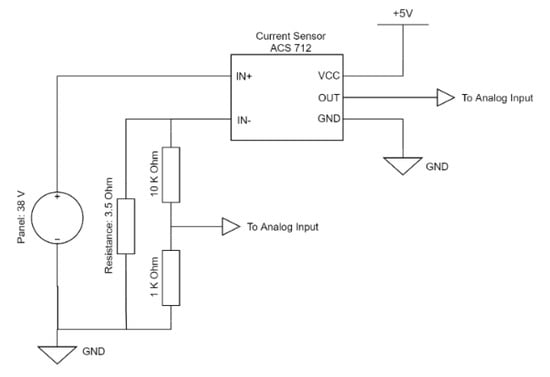The used solar panels characteristics are 38 V, 8 A and 275 W peak. To dissipate the generated power, shielded resistances of 3.5 Ω were used in an aqueous bath. The voltage is monitored by means of a voltage divider circuit with an attenuation factor of 1 to 11, connected directly to the Arduino AD converter (Figure 9). The current is measured by and ACS712 Hall Effect sensor, whose output is connected to the ADS1115 AD converter, in order to increase measurement accuracy. The Arduino, through the direct multiplication of the voltage by the current, calculates the generated power in each panel.