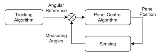 Control systems used in solar trackers can be open or closed loop. Closed loop controllers have as their main feature the feedback signal of the output variable. Sensors are used to determine appropriate Sun position parameters, which are manipulated by the controller through tracking and control algorithms and techniques, and then trigger the device’s reorientation mechanisms towards the Sun []. Conversely, open loop controllers do not use feedback and decision-making is based only on the current state of the system. Thus, open loop controllers are simpler and cheaper, but do not allow for correcting steady state errors, as well as compensating for disturbances during system operation [].