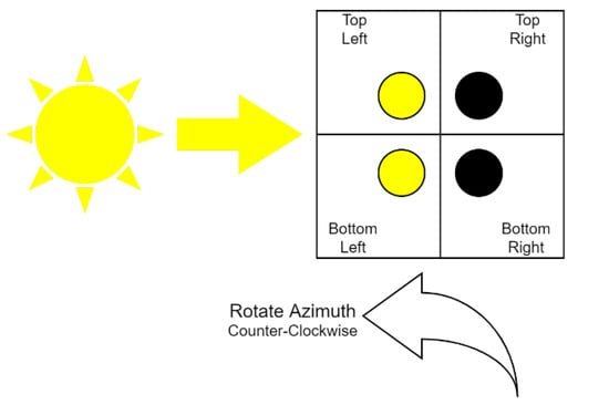 The Sun tracking method employed is based on using four light sensors in a cross structure. The sensors are light-dependent resistors (LDR) whose resistance drops dramatically with the incidence of light (from MΩ to a few hundred Ω). Each LDR is connected to a voltage divider circuit together with a resistor, so the light intensity can be measured indirectly through the analog to digital converter. When the cross structure is aligned with the Sun’s rays, the four sensors are illuminated equally, resulting in very close voltage readings. When misalignment occurs, LDRs receive light unevenly, causing an imbalance in sensors readings. Figure 11 illustrates the Sun’s rays striking unevenly between the left and right sensors, causing a reading difference that indicates the direction of rotation in the azimuth angle. The same principle can be applied when there is an imbalance between the lower and upper sensors whose voltage difference points to the direction of rotation at the elevation angle.