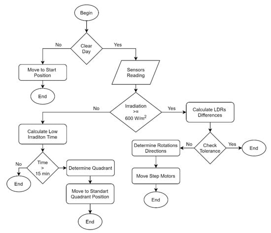 Figure 12 presents the flowchart of the sensor-tracking algorithm, divided into three situations: nightfall, daylight with irradiation lower than 600 W/m2 and daylight with irradiation higher than 600 W/m2. During nightfall, both the tracker and the movable panel structure moves towards the east in an initial position. The tracking strategy based on light sensors depends on high irradiation level; therefore, when the irradiation is below minimum, the tracker does not move, and if this situation lasts more than fifteen minutes, the movable panel structure moves towards a default position based on the current hour of the day. When irradiation levels exceed the minimum, the algorithm follows the proposed methodology, moving the step-motors based on the LDR reading difference. As soon as the LDR difference became within a tolerance, the tracking algorithm converge and output the elevation and azimuth angles as reference to the positioning algorithm.