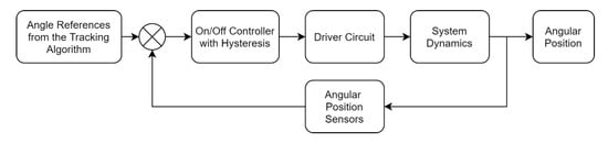 A simple closed loop on-off controller with hysteresis performs the movable solar panel angular position control, as shown in Figure 13. The angular reference comes from the tracking algorithm and is used, together with sensing, to determine the error signal. This signal determines the full bridge inverter direction of activation to drive the two DC motors. In this type of controller, hysteresis allows a balance zone around the reference point, preventing unnecessary and continuous switching of the actuator.
