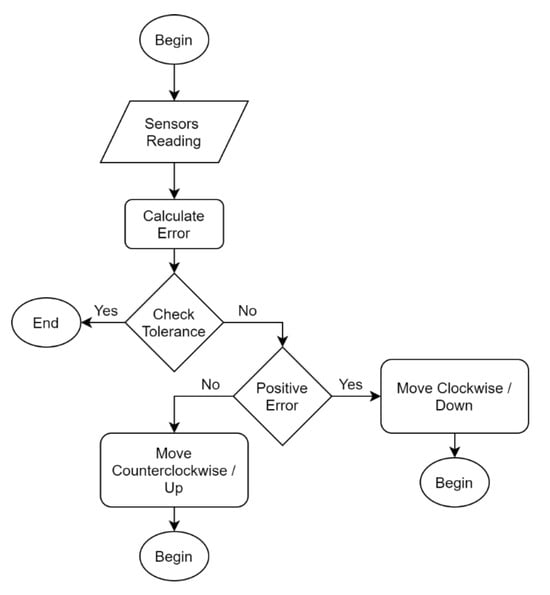 Figure 14 shows the solar panel control algorithm flowchart. The DC motor movement direction is determined by the calculated error. As soon as this error comes within a 1° hysteresis, the algorithm converges and the motors are turned off.