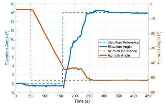 Figure 15 shows the tracking algorithm response, with the elevation angle and reference in blue and the azimuth angle and reference in red. It can be observed that the variation in azimuth angle was approximately 50 degrees, leading to a convergence time of 220 s. For the elevation angle, the variation was 16 degrees, with a convergence time of 158 s. Although long, the convergence times are compatible with solar movement, which is approximately 15 degrees per hour. It is important to note that the two angles are actuated simultaneously, seeking the apparent position of the Sun.