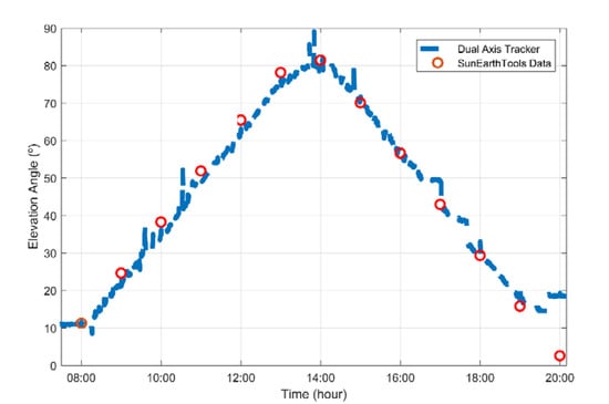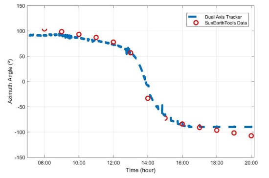 Figure 16 and Figure 17 illustrate the behavior of the tracker’s elevation and azimuth angle (in blue) compared to SunEarthTools database (in red) in February 1st (summer) []. In the first half of the day, the tracker presents a small difference from the values provided by the database, in contrast to the second half, where the values almost overlap. Relative to the elevation angle, the tracker presents some peaks due to the tracking algorithm, as well as two inoperative moments (between 16 h 30 min and 18 h) due to the presence of clouds and operates from 10° to 90°. The tracker azimuth angle is mechanically restricted to operate from −108° to 108°.