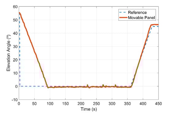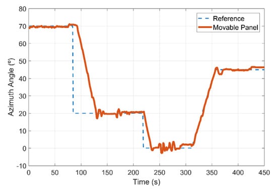To evaluate the movable panel position control, a step and a ramp were inserted at the reference. Figure 18 shows the azimuth angle response, with a step from 70 to 20 degrees, followed by another step from 20 to 0 degrees, and a ramp from 0 to 45 degrees at a rate of 1 degree per second. The DC motor speed is slow due to the reduction gearbox, making the step response slow. Regarding stability, the on-off control system features overshoot, associated with wind incidence and a small gear backlash. For the angle of elevation (Figure 19), the overshoot is smaller because the mechanical system is heavier and better fitted, so that the influence of wind is smaller.
