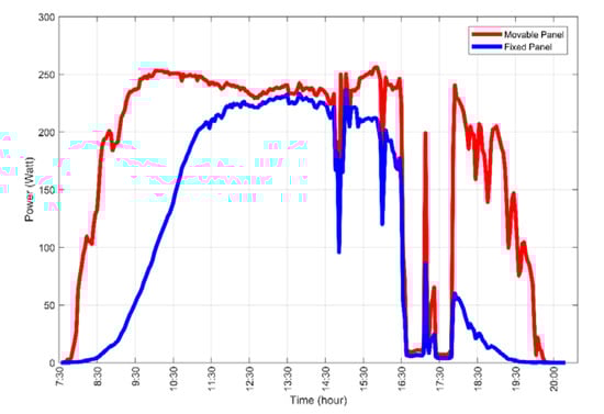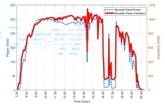 Figure 20 shows the power generated by the fixed panel in blue and by the movable panel in red on February 1st. It can be seen that the movable panel has an expressive power output at 8:00 a.m. reaching a maximum at 9:30 a.m., while the fixed panel starts to have a significant power only at 8:30 a.m. and reaches its maximum value at noon. In this period of about four hours, the power observed in the tracking system exceeds the power of conventional fixed systems. This phenomenon repeats at 3:30 p.m., but it is interrupted due to the presence of clouds between 4:30 p.m. and 5:30 p.m. In total, the fixed photovoltaic system generated 1300 Wh, while the solar tracking system generated 2115 Wh, indicating a total energy gain of 815 Wh on this day, equivalent to 62.58%. To power the tracking and positioning system, the direct voltage source provided 76.93 Wh, causing the net energy gain to fall to 737 Wh, or 56.67%. Figure 21 shows the relation between the irradiation and power generated by the movable panel in the same day. The two curves follow the same pattern, with peaks and lows at the same time, except for the central period in which the high temperature affects the panel efficiency. The total irradiation received on this day was 13,712 Wh, leading to 15.42% panel efficiency.