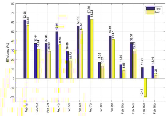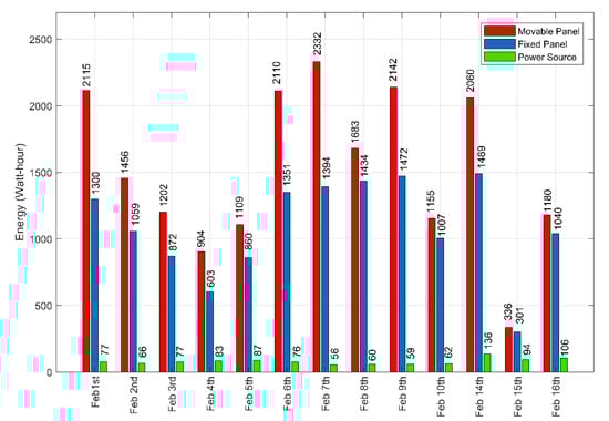 The system operated from February 1st to 16th, in which three days’ worth of data were corrupted (11th to 13th), six days were sunny (1st, 6th to 9th and 14th), six days were cloudy (2nd to 5th, 10th and 16th) and one day had heavy rain (15th). Figure 22 shows an energy comparison between the movable panel, fixed panel and the power source. February 7th is an example of a sunny day, wherein the movable panel generated 2332 Wh, the fixed panel generated 1394 Wh and the power source consumed 56 Wh, resulting in a total gain of 67.28% and net gain of 63.22%. For cloudy days, the systems total and mostly the net efficiency drops—ion February 3rd, the movable panel generated 1202 Wh, the fixed panel generated 872 Wh and the power source consumed 77.18 Wh, resulting in a total gain of 37.84% and net gain of 28.99%. The worst possible climate condition is heavy rain with small periods of high irradiation, like February 15th. On this day, the movable panel generated 336 Wh, the fixed panel generated 301 Wh and the power source consumed 94 Wh, resulting in a total gain of 11.71% and net gain of −19.47%. During the experimental period, the movable panel generated 19,784 Wh, the fixed panel generated 14,182 Wh and the power source consumed 4562 Wh, leading to a total gain of 39.5% and net gain of 32.16%. It is worth noting that the movable panel generated more power than the fixed panel on every analyzed day. In regard to the system efficiency, Figure 23 summarizes the obtained values for the total and net gains, which have a strong relationship with the incidence of clouds and rain.