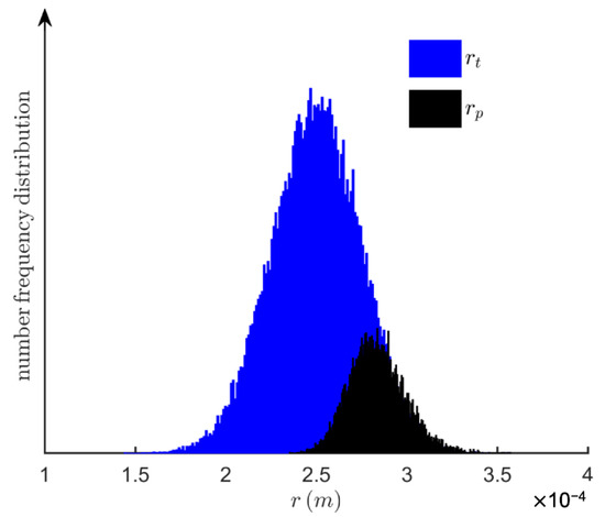 Pore and throat radius distribution for the random network with throat mean radius 250 µm and the standard deviation 25 µm. The pore radius is assumed larger or at least equal with the largest radius of neighbor throats.