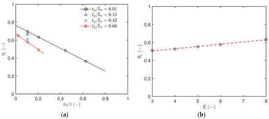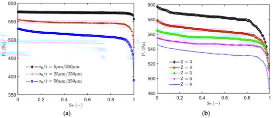 Figure 7 and Figure 8 show the variations of capillary pressure-effective saturation at various morphologies obtained from the pore network modeling (Section 2). Three microstructural parameters of the network are discussed: (1) mean throat/pore radius () (Figure 7), (2) standard deviation in PSD and TSD () (Figure 8), (3) pore connectivity (Z) (Figure 8). They all affect the capillary-saturation profile of a porous medium in the capillarity-controlled IP.