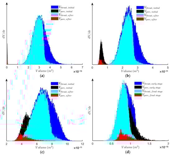 The volume distribution of liquid-filled throats and pores in the network at the beginning of the capillarity-controlled IP process and at for a single simulation: (a) = 1/10 (µm), = 0.01 (b) = 10/100 (µm), (c) = 20/200 (µm), and (d) = 25/250 (µm), . The network connectivity is 6.
