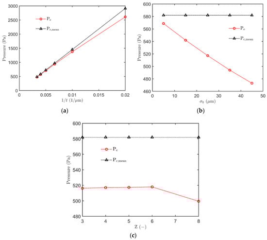 In this section, we show that TSD and PSD play critical roles in entry pressure. Figure 6 shows the relation of entry pressure Pe and mean capillary pressure (Pc,mean) with the porous medium properties. The entry pressure is computed using the algorithm described in Section 2. The mean capillary pressure is calculated by the Young–Laplace equation (Equation (4)), averaging the throat and pore radii in the network with perfect wetting assumption. Here, the mean capillary pressure Pc,mean is a reference capillary pressure.