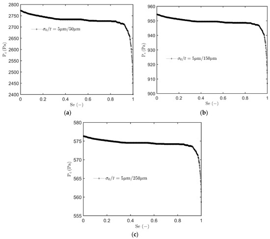 As can be seen in Figure 7, the capillary pressure strongly depends on the mean radius. With increasing mean radius, the value of capillary pressure decreases. This behavior is expected as the capillary pressure is inversely proportional to the mean radius according to the Young–Laplace equation (Equation (4)). Since the capillary pressure in the Brooks and Corey model is presented as a function of effective saturation, the saturation is converted into effective saturation (Se) using Equation (3). One can see that the overall behavior of the capillary pressure-effective saturation profiles obtained in this work agrees with the experimental measurements by Hilpert and Miller [39] and simulation observations by Sweijen et al. [40].