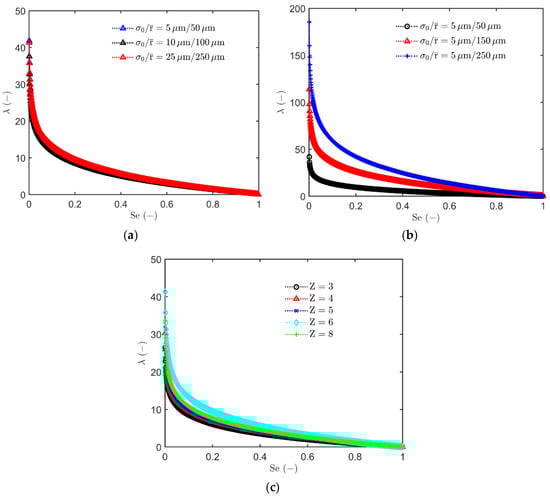 The exponent λ related with (a) and (b) the ratio of standard deviation over the mean radius / with pore connectivity Z = 6, and (c) pore connectivity at = 25/250 (µm). The values are averaged over 40 realizations.