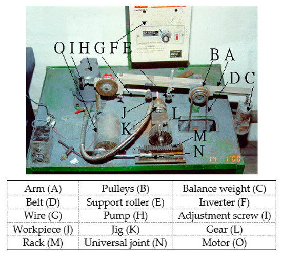 Figure 1 shows the experimental setup for the single wire-sawing system that is used for this study. The inverter (F) and the position of the belt (D) for the pulley (B) were adjusted to control the wire speed. The adjustment screw (I) was adjusted to achieve the proper wire (G) tension. The working load was varied by adjusting the balance weight (C) on the arm (A). A pump (H) was used to stir and supply slurry. The workpiece (J) was fixed to a jig (K). The motor (O) drives the rack (M) through a universal joint (N). The rack moves back and forth and drives the gear (L), which rotates in the same direction (gear (L)) and shares the same central shaft as the jig (K).