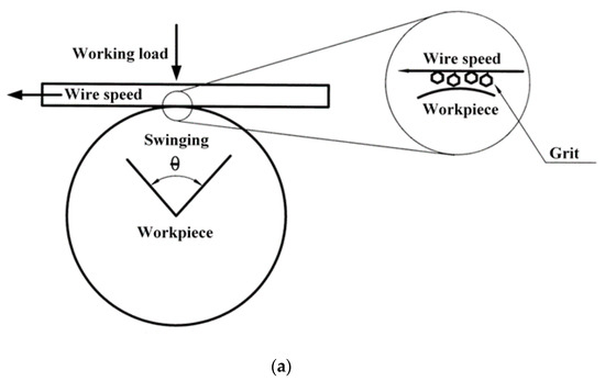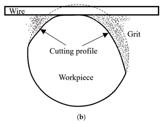 Figure 2a shows that the workpiece (J) swings back and forth. Figure 2b shows the length of contact between the wire and the workpiece during WSM. This swinging machining model exerts a uniform cutting force on each active grain and allows efficient disposal of chips. The main experimental conditions are listed in Table 1, wherein the slurry concentration is shown as a percentage of the weight of the slurry grain (weight of grain/weight of slurry as a whole). The MRR and wire wear (WW) for each SWSM is calculated using Equations (1) and (2), which are defined as follows: