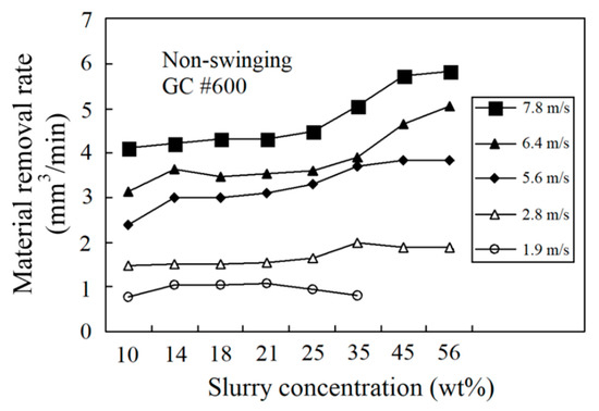 For a process that involves swinging, there is no decrease in the working load that is exerted by each active grain and less time is required for grains to enter and exit the cutting zone. The disposal of chips is also more efficient. WSM with swinging results in a higher MRR. If many active grains enter the cutting zone, grain stacking and interference prevent the grains from moving so the MRR is decreased. The cutting zone for a process that involves swinging is shorter than that for a process that does not involve swinging, so grain stacking and the peak MRR are achieved at a medium slurry concentration.