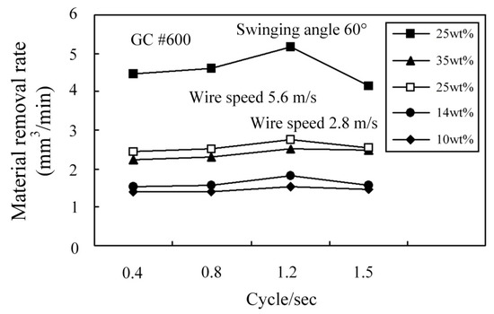 Swinging angles of 40°, 60° and 90° do not significantly affect the MRR. If only fine grains are present in the slurry, such as GC #1000 grains, the MRR is very small. If large GC #600 grains are used, these larger grains are not suspended in the slurry, so they are deposited in the slurry and are brought into the cutting zone by the wire, which gives better machining efficiency than is possible for fine GC #1000 grains.