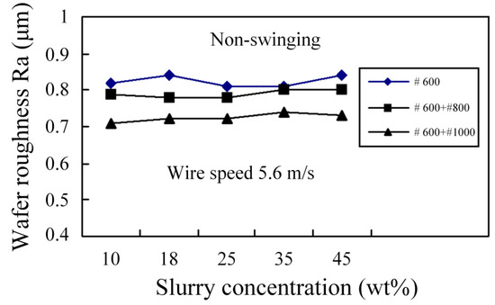 The wire speed and slurry concentration are directly related to MRR for WSM. Figure 3 shows the experimental results for MRR for a non-swinging scenario for different wire speeds and slurry concentrations. The peak MRR is achieved at a higher slurry concentration and a higher wire speed. As the wire speed increases, the peak MRR is only achieved by increasing slurry concentration. This demonstrates that material is almost exclusively removed by the active grains in the slurry. The greater the slurry concentration, the greater is the number of active grains, so there is an obvious increase in the MRR. At a lower wire speed, active grains are removed more slowly from the machining zone so increasing the wire speed results in a greater MRR from the machining zone for a non-swinging scenario.
