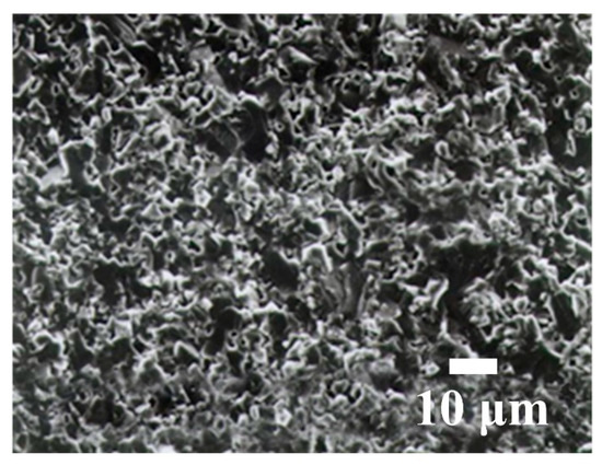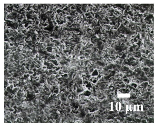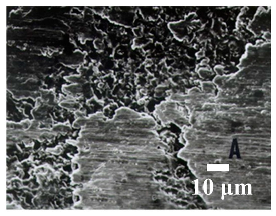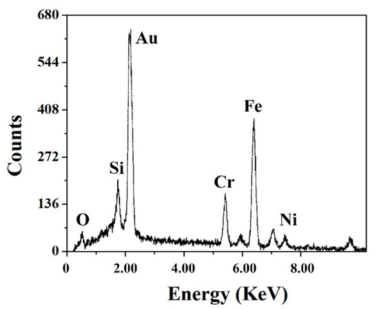 Figure 14 shows a SEM microphotograph of Al2O3 if no slurry is used. The energy-dispersive spectrometer (EDS) result for zone A (in Figure 14) is shown in Figure 15 and shows the microstructure of stainless steel, which contains Fe, Cr, Ni, and Si. If there is no slurry, the wire has no machining capability, so it becomes welded onto the workpiece surface.