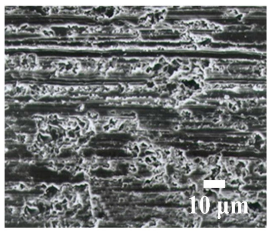 where is the original weight before SWSM and is the actual weight after SWSM, is the original diameter before SWSM, is the diameter after SWSM and t is the period for SWSM. A tool microscope (Nikon, MM-40, Tokyo, Japan) acts as an optical ruler to accurately measure the wire wear to an accuracy of 1 μm. A tension meter (IMADA, DPRSX-10TR, Toyohashi, Japan) was used to measure the wire tension and working load. The surface morphology was determined using field emission scanning electron microscopy (JEOL JSM-6300 SEM, Tokyo, Japan).