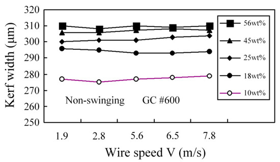 Figure 16 shows the experimental results for different wire speeds and concentrations. Increasing the wire speed has no significant effect on the kerf width. As the concentration increases, the number of grains that enters both sides of the stainless steel wire increases so the kerf is wider. Figure 17 shows that there is only a slight difference in the kerf width for swinging and non-swinging WSM. However, WSM with swinging produces a wider kerf than non-swinging WSM.