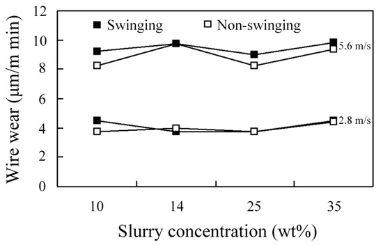 Effect of swinging and non-swinging processes on wire wear for different slurry concentrations and wire speeds.