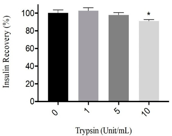 The degradation of human recombinant insulin by trypsin was examined in vitro. Figure 1 shows the recovery percentage of insulin after incubation with different trypsin concentrations ranging from 0 to 10 U/mL. After 3 h of incubation with trypsin (1 and 5 U/mL), the loss appears to be less than 5%. Trypsin has shown an effect on insulin (human recombinant insulin). As the trypsin concentration increased from 1 to 10 U/mL, a decline in insulin recovery was observed. However, the impacts of 1 and 5 U/mL of trypsin on insulin were very low compared to 10 U/mL. It was reported that trypsin itself has a very slight rate of degradation effect on insulin, as it only favors the cleavage of B29-Lys and B22-Arg residues, which are not the dominant amino acids in insulin [30,35]. Our result was consistent with such previous findings, as the percentage of insulin recovery was less affected by the exposure to tryptic activity up to 5 U/mL. This result was used to select the enzyme concentrations to model proteolytic enzymes against protamine in subcutaneous tissues without harming insulin significantly.