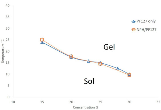 The (lower) sol-gel phase transition curves of PF127 and NPH-PF127 are shown in Figure 2, where the gelation temperatures are plotted against the PF127 concentrations for both PF127 and NPH-PF127. The PF127 concentrations of 15% to 30% display reverse thermal gelation at gelation temperatures ranging from 10 to 24 °C. NPH-PF127 with the concentration range from 15% to 30% exhibited similar gelation characteristics to PF127 solutions. The gelation temperature decreases with an increasing PF127 concentration, which is consistent with published studies [36,37]. The aqueous solution of PF127 is a micellar solution and, upon increase in temperature, micelle packing occurs as a result of the partial dehydration process of both the hydrophilic chain (polyoxyethylene) and the hydrophobic chain (polyoxypropylene) of the copolymer, resulting in a gel state. We have observed a somewhat loose gelation at the PF127 concentration of 15% (w/w) in PBS, which suggests that the concentration was approaching its critical gel concentration (CGC) in the isotonic buffer. In pure water, its CGC is estimated to be ~17 °C [38]. In Figure 2, the upper transition curves (gel to syneresis) were not plotted as those temperatures far exceed the temperature of interest.