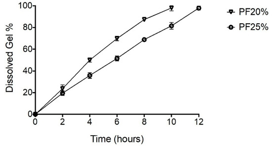 The erosion rate of NPH-PF127 hydrogel was investigated in vitro using a dialysis membrane by measuring the mass loss of the insulin microcrystal-loaded gel over time. As shown in Figure 5, increasing the PF127 concentration correlated with decreasing the percentage of dissolved gel for all time. The % mass loss of the NPH-PF127 gel followed a zero-order kinetics exhibiting linearity for all the hydrogel concentrations. The erosion kinetic results are in agreement with those of other studies [36,37]. The aqueous gel viscosity increased as a result of increasing the PF127 concentration, at which the penetration of the dissolution medium through the hydrogel surface is thought to be more restrictive.