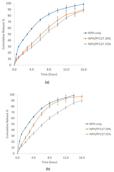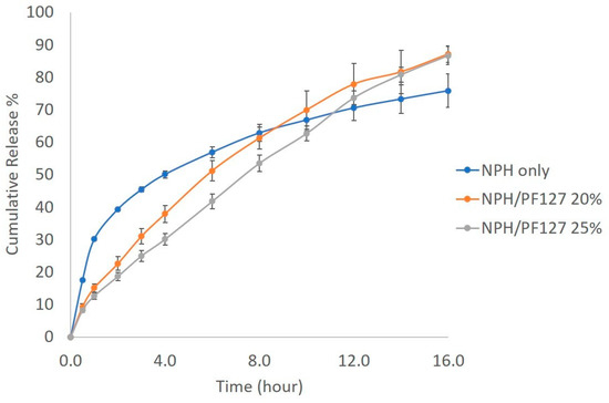 The in vitro insulin release from NPH alone and NPH loaded PF127 was investigated using the dialysis method at 37 °C. Figure 6 shows the initial burst release of 40% of insulin from NPH microcrystals during the first 2 h, followed by a relatively flatter release profile until the end of the experiment. The release of insulin from NPH microcrystal hydrogel (NPH-PF127) was steady and slow. The presence of PF127 reduced the burst of insulin release by 20% during the first 6 h in comparison to NPH only and, unlike the NPH only, the drug release from PF127 (both 20% and 25%) was more continuous, reaching a higher cumulative percent release at the end of the experiment. In both polymer concentrations, the drug release was well-correlated (R2 > 0.99) with the mass loss of the polymer (see Figure S3 in the Supplementary Information).