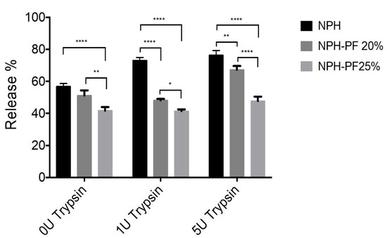 Comparison of the insulin release in vitro at t = 6 h: NPH, NPH-PF127 (20%), and NPH-PF127 (25%) without and with (1–5 U/mL) trypsin. Values represent the mean ± S.D. (n = 3). Statistically significant differences (**** p < 0.0001, ** p < 0.001, and * p < 0.01) in the % release values (at t = 6 h) between each paired group were obtained using Tukey’s post hoc test.