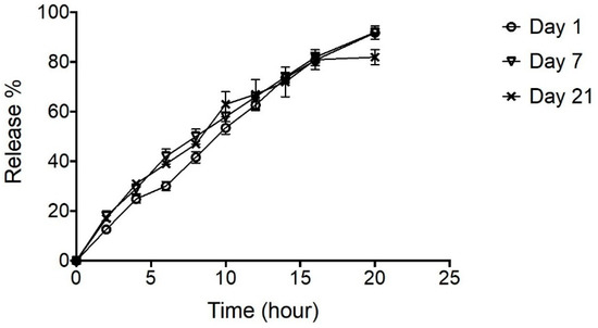 In vitro release of insulin (NPH- PF127 25%) at day 1, 7, and 21 upon storage at 4 °C. Data are expressed as means ± S.D. (n = 3).