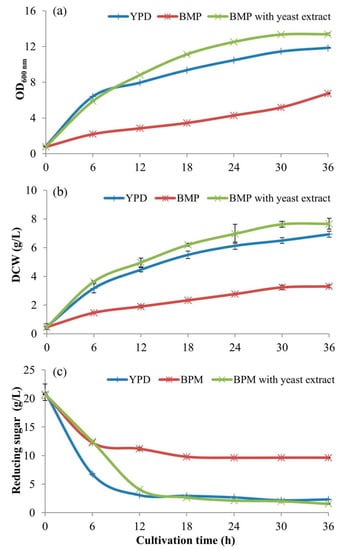 Yeast extract contains abundant components (% w/w) of carbohydrates and derivatives (~10–35%), proteins (~45–50%) and free amino acids (~8–15%), vitamin derivatives (~5–10%), minerals and trace elements (~5–10%), nucleotides (~5–15%), and fat (~3–10%), which are necessary for microbial cell growth [23]. The BPM defined medium added with the YE is actually called “semi-defined medium”. The medium was mostly composed of the defined components with only one or two complex nutrients [24]. In this research work, it was the effective medium for yeast cell cultivation because it enhanced higher cell biomass concentration than that of the standard medium (YPD). The BPM can be both defined and semi-defined medium that has many advantages to be used both in the laboratory and at the industrial scale. It is much cheaper (~0.035–0.045 US $ per liter), when compared to a laboratory medium of ~0.85 US $ per liter which is ~25 times higher. The BPM is simpler to be produced and easier to be controlled in fermentation and downstream processes effecting lower cost of investment [25].