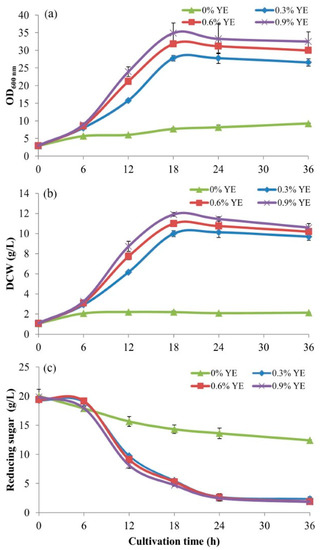 From the above experimental result, in order to enhance more efficient utilization of BPM by S. cerevisiae, yeast extract (Hi-media, India), the major source of complex nutrients was supplemented into the BPM of 20 g/L of glucose. The experiment was conducted using 500-mL baffled flasks contained 100 mL of BPM supplemented with YE at concentrations of 0, 0.3, 0.6, and 0.9% (w/v). The initial pH of the media was adjusted to 4.5 with 4 N NaOH and 4 N HCl. After autoclaving and leaving to a temperature of 30 °C, the 5-mL inoculant volumes (from Section 2.1) were inoculated into the four cultivation media and incubated at 30 °C in a rotary incubator shaker at a speed of 200 rpm for 36 h. The culture broth samples of 5 mL were withdrawn every 6 h for the first 24 h and after that every 12 h. They were put on ice for 20 min to suddenly drop the temperature to 2 °C to stop cell activities before keeping them at 5–10 °C for further analyses.