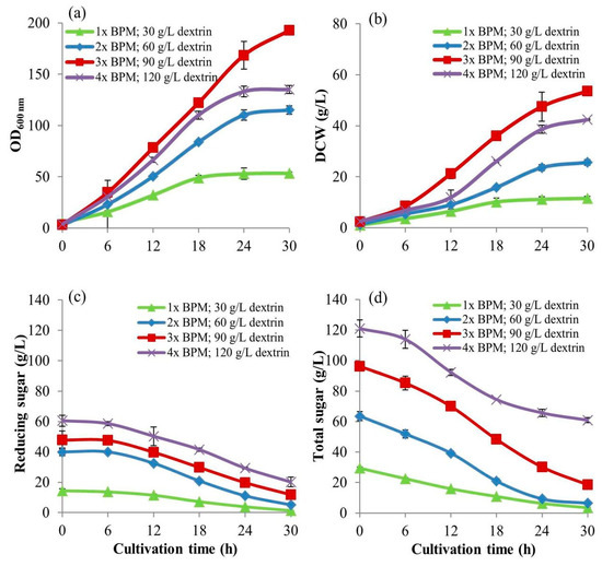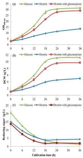 Actually, yeast S. cerevisiae can utilize many different C-sources, such as glucose, fructose, galactose, mannose, and other alternative sources of the disaccharide, e.g., maltose and sucrose [29,30]. Glucose is the most popular C-source for yeast cultivation for the production of biological products as it provides fast growth other than other sugars. It is consumed first in sugar mixtures. However, it causes some limitations and problems as discussed above. To overcome those limitations, this research was challenged to the use of dextrin, the oligomer of glucose, the primary hydrolysate from cassava starch liquefaction as a new potential C-source to substitute glucose for S. cerevisiae cultivation.