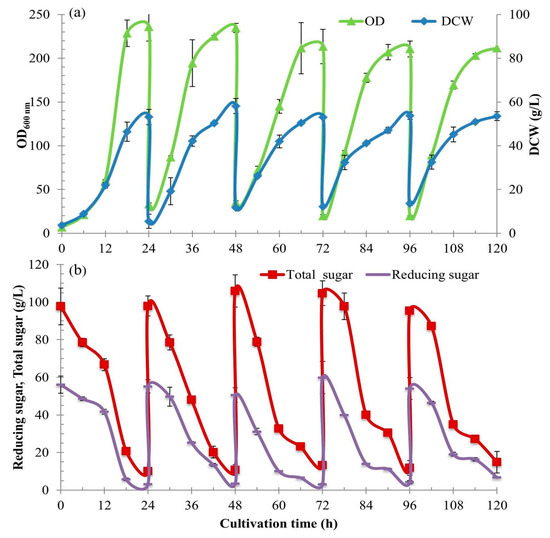 Following the first batch, the intensive multiple sequential batch operations were further continually repeated for four more cycles without newly batch up and sterilization. When each batch was completed, a major culture broth was discharged using a peristaltic pump, leaving only a 150 mL to be the starter inoculum for the next batch (at 5% v/v). Unlike the initial batch, the inoculants of the batch cycles 2–5 were the high cell density starters (the culture broths left from the prior batches).