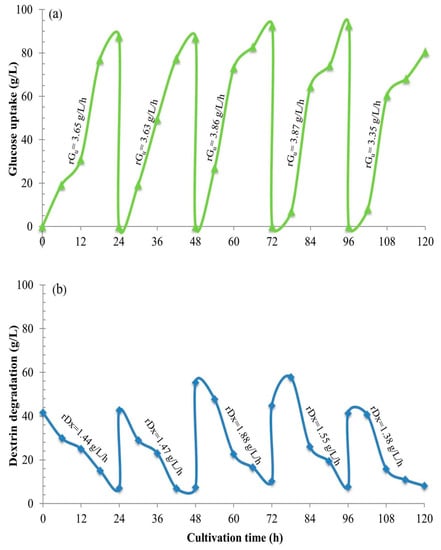 (a) Glucose uptake into the cells (green line) and (b) dextrin hydrolysis to release glucose (blue line), and their rates (slopes of rGu = dGu/dt and rDx = dDx/dt) during cultivation of S. cerevisiae with the intensive multiple sequential batches for 5-cycle runs using 3× BPM with 90 g/L of dextrin and 9 g/L (0.9% w/v) of yeast extract, operating at the impeller speed of 700 rpm ( = 3 W/kg) with the airflow rate at 3 vvm.