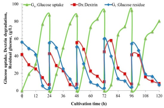 During the time of the first batch cultivation, a further 3000 mL of the fresh medium of the same components and concentration was prepared. Dextrin solution was again prepared. It was sterilized separately and then newly added into the same bioreactor after the first culture broth withdrawal. The second cultivation process was again restarted under the same controlled conditions. The cultivation process was continually repeated for five cycles. Along with the five cultivations, the culture broth samples of 10 mL were withdrawn every 6 h for 24 h. They were put on ice for 20 min for the same reason above and kept at −20 °C for further analyses.