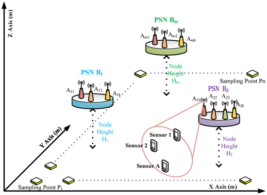 It is assumed that there are m PSNs in region R of the WRSNs. The PSNs are installed on fixed or mobile platforms with a certain height and equipped with a large-capacity power system, as shown in Figure 1. The mobile platforms, such as aerial platforms and UAVs, can be returned to recharge after completing the power supply mission and perform the next mission. represents the set of PSNs, where denotes the PSN. represents the set of antennas mounted on a node, where denotes the antenna of the PSN. represents the set of signal strength sampling points, where denotes the sampling point. There are n sampling points in this region, which are generated at equal intervals after meshing the region. Each antenna charges multiple sensor nodes in the area covered. Remote field charging is realized by using MPT technology with high charge efficiency.