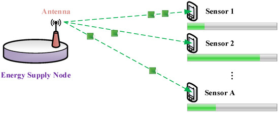 WRSNs are usually used in areas where maintenance is inconvenient and energy resources of PSNs are limited. In our scheme, the antenna charges all sensor nodes automatically according to the designed QGES algorithm in the area coverage. The energy is divided into multiple energy packets for a fixed duration. In an energy supply cycle, it is assumed that each antenna transfers energy packets in a Poisson distribution with time intervals following parameters to supply energy to the nodes. The energy packet consumption rates of different sensor nodes in the coverage area of the antenna obey the general distribution. The players in the game are the energy packets. Nodes receive energy packets and store them in the power system, where they wait for consumption, and then convert them into network value to obtain benefit . During charging and waiting, a sensor node needs to pay corresponding cost C per unit time, which indicates the decline of power life and the energy conversion efficiency of nodes. To maximize the social welfare of the energy supply system, the problem can be transformed into an optimal strategy for energy packets to be allocated to different sensor nodes with minimal cost. As shown in Figure 3, the power supply system model is composed of PSN antennas, sensors, and a power supply strategy based on a queuing game.