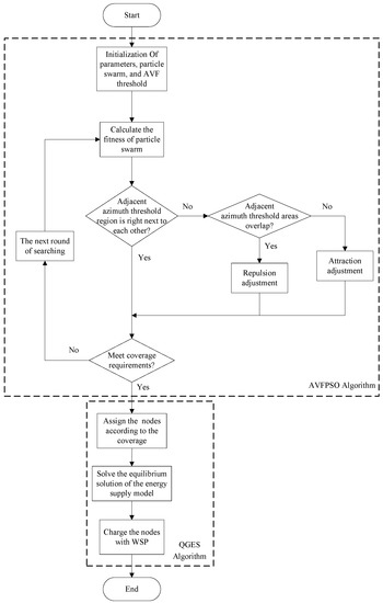 The AVFPSO algorithm and QGES algorithm are combined to realize the TPEM scheme for WRSNs, as shown in Figure 5.