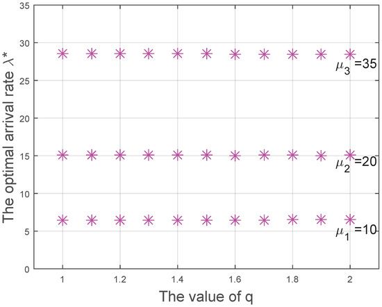 is a fixed value satisfying , and is the optimal arrival rate. The solution of Equation (39) can be obtained as
