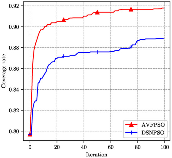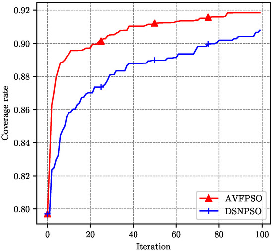 Firstly, the number of particle swarms was set to 10. As shown in Figure 9, the coverage implemented by AVFPSO algorithm was higher than that of DSNPSO algorithm in the whole iteration running interval. The AVFPSO algorithm also converged faster. Then we increased the number of particle swarms to 20. As shown in Figure 10, similarly to the previous results, the AVFPSO algorithm was still better than DSNPSO in terms of overall coverage performance and algorithm convergence. In the case of a larger particle swarm, the gap between the two was slightly larger than before. By comparing the AVFPSO algorithm with 10 particles and the DSNPSO algorithm with 20 particles, it can be observed that the performance of AVFPSO algorithm was still better than that of DSNPSO algorithm, even if the number of particle swarms was small. It means that the AVFPSO algorithm can get a faster search speed with the aid of virtual force algorithm.