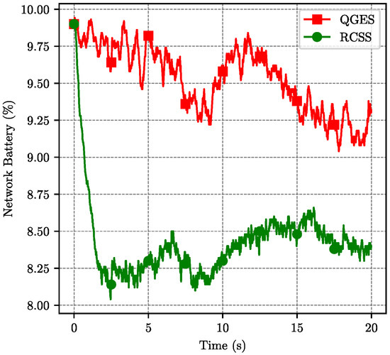 A real-time demand scheduling scheme (RCSS) [26] has been selected for a comparison of QGES algorithms. As shown in Figure 11, the Y-coordinate indicates the total electric quantity of the system. If the power is 0, it means that the system cannot work normally due to the power failure of one or more sensor nodes. Both algorithms start with the same initial electric quantity. The electric quantity obtained by each node is not uniform. When the electric quantity of some nodes is too low, the RCSS algorithm charges them to ensure the normal operation of the system. QGES algorithm is a balanced charging method based on the strategy of each node. The power of the system decreases slowly in a wave mode, indicating that each node in the network can maintain a relatively balanced power. As shown in Figure 12, within a short time after the system is started, the total power of the network charged by the RCSS algorithm decreases significantly. Overall, the QGES algorithm allows the system to maintain a higher power level than RCSS, allowing the network to operate for longer periods with the same amount of power.