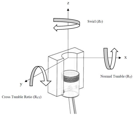 In order to characterize the large scale in-cylinder air-fuel mixing during the intake and compression strokes, three main components that influence the in-cylinder air flow motion, namely Rs, RT and RCT were calculated based on the crank angle engine stroke. Figure 6 shows the swirl, tumble and cross tumble ratio orientation diagrams acting on the cylinder. The dimensionless parameter used to quantify the rotational and angular motion inside the cylinder commonly characterized the swirl, tumble and cross tumble ratio. These values were calculated by dividing the engine speed by the effective angular velocity of the in-cylinder air motion. The three variables investigated in this paper (swirl, tumble and cross tumble ratio) are presented in non-dimensionless equations [32], as follows: