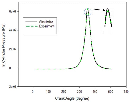 Figure 7 illustrates the in-cylinder pressure (Pa) against the crank angle (θ) for both the experimental and numerical results of the engine operation without combustion at a rotational speed of 2000 rpm for the intake temperature and pressure of 302 K and 102 kPa, respectively. The numerical data collected with the GVD consist of intake, compression, and expansion stroke between 0° to 540°. Based on the results, a good agreement between numerical and experimental results with a slight difference of about 7% at the peak pressure was observed. This might be due to the friction loss that occurred inside the cylinder while running the experiment, a factor which is not possible to include in simulation through numerical analysis.