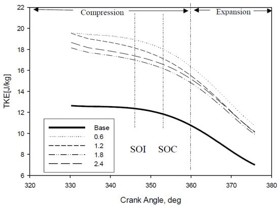 Theoretically, TKE is the mean kinetic energy per unit mass associated with eddies in a turbulent flow [3,34]. In other terms, it is the fluctuation of velocity in the in-cylinder airflow and is calculated based on the root-mean-square. During the movement of the piston in the compression stroke, the piston moves from the bottom dead centre (BDC) towards the top dead centre (TDC) and reduces the volume of the combustion chamber, hence limiting the fluctuation of the cylinder airflow motion. When the piston approaches the TDC, the velocity of air starts to decrease and becomes zero after reaching the TDC. Therefore, TKE is expected to decrease during this time. Several researchers studied and confirmed that the trend of turbulence pattern diminished linearly while the piston was heading towards the TDC [35,36]. Furthermore, Payri et al. investigated and found that in the early stage of the intake stroke, the piston geometry had little effect on the in-cylinder airflow [35]. However, the piston-bowl geometry played a significant role during the movement of the piston approaching the TDC in the compression stroke and the early stage of the expansion stroke. Figure 8 demonstrates that the base engine without GVD showed the lowest magnitude of TKE compared to the other modifications of GVD. The TKE of the vane modified engine compared with the baseline engine showed a 30% difference with 1.8D (L), 35% with 2.4D (L), 40% with 1.2D (L), and 45% with 0.6D (L).