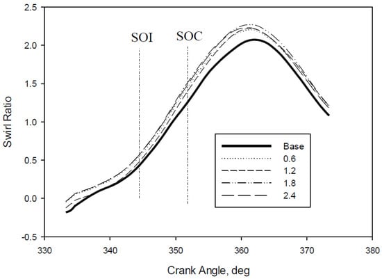 The in-cylinder airflow motion in the combustion chamber is an important factor that will determine the scale of air and fuel mixing during the intake and compression stroke, particularly in the velocity streamline. The three main components of air structure that will influence the combustion efficiency are RS, RT, and RCT. Figure 9 shows the in-cylinder air flow swirling strength (Rs) of the local swirling motion. Rs is defined by the organized movement of fresh air around the cylinder axis. Swirl is created by an initial angular momentum of the intake airflow into the cylinder. In a diesel engine, the swirl ratio is important for the preparation of the air-fuel mixture. The swirl effect can be induced by a special intake port(s) shapes created by the rotational flow in the intake valve area transferred to the cylinder during the intake process [37]. The simulation results for various vane lengths are illustrated in Figure 9, which shows the magnitude of Rs. Based on Figure 9, it is found that all the variations of the GVD model witness an improvement in the Rs compared to the base model. In combustion theory, the generation of swirl inside the combustion chamber during the injection period assists in breaking down the molecular chain and practically improves the mixing process of air and fuel, thereby ultimately improving the combustion and engine efficiency [38]. The GVD design of 0.6D (L) represents the optimum guide vane length to enhance Rs produced during the start of injection (SOI) and the start of combustion (SOC).